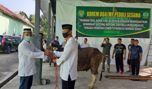 Kepala Staf Korem 064/Maulana Yusuf Kolonel Inf Sugiyono pagi tadi menyerahkan secara simbolis hewan qurban berupa satu ekor sapi dari jumlah keseluruhan sebanyak 8 ekor sapi dan 8 ekor kambing kepada Kabintal Korem 064/MY H. Ahmad Yani di Makorem 064/MY Serang, Banten, Jum’at (31/7/2020).