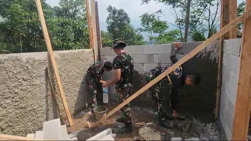 Sasaran tambahan pada program TMMD ke 121 Kodim 0601/Pandeglang berupa perehaban Rumah Tidak Layak Huni (RTLH) di kampung Nanggorak desa Cikumbueun kecamatan Mandalawangi Pandeglang Banten, memasuki proses pekerjaan dinding pemasangan bata ringan (Hebel), kusen pintu dan jendela, Rabu (31/07/24)