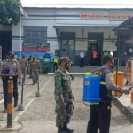SERANG,- Personel Polsek Serang Polda Banten ,TNI dan Satpol PPmelakukan penyemprotan cairan disinfektan di Stasiun Serang Kel. Cimuncang Kec Dan Kota. Serang,