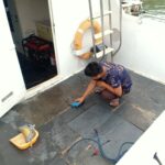 Cilegon – Personel Ditpolairud Polda Banten lakukan pemeliharaan dan perawatan (Harwat) kapal patroli Polisi XXIII-2002 di pangkalan Pulorida. Pemeliharaan dan perawatan tersebut