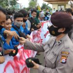 KOTA SERANG – Guna mencegah penyebaran Covid-19, Personel Polres Serang Kota bagikan masker di aksi unjuk rasa mahasiswa di depan Kantor DPRD