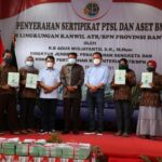 Tangerang – Direktur Jendral Penanganan Sengketa dan Konflik Pertanahan Kementerian ATR/BPN, R.B Agus Widjayanto menyerahkan sertifikat PTSL dan aset BMN di lingkungan