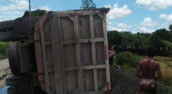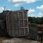 Akibat Jalan Simpang – Beyeh Rusak Parah, Mobil Truk Bermuatan Klinker Terguling