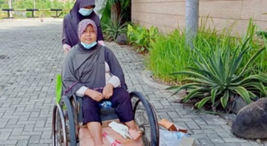 CILEGON – Seorang Wanita tengah baya duduk dikursi roda dengan kondisi kaki yang tidak sempurna bersama putrinya sedang meneduh sambil istirahat sambil