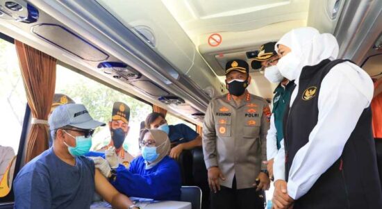 Gagasan gerai vaksin mobile Polresta Sidoarjo menyedot perhatian masyarakat pada kegiatan vaksinasi di GOR Delta Sidoarjo, Rabu (1/9/2021). Pasalnya, vaksinasi Covid-19 dilakukan