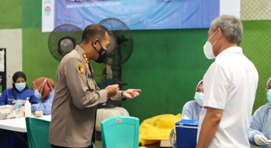 CILEGON – Polres Cilegon Cilegon Polda Banten bersama Gerakan Relawan Jokowi (GRJ) mendukung penuh kegiatan vaksinasi untuk mensukseskan program Presiden Jokowi di