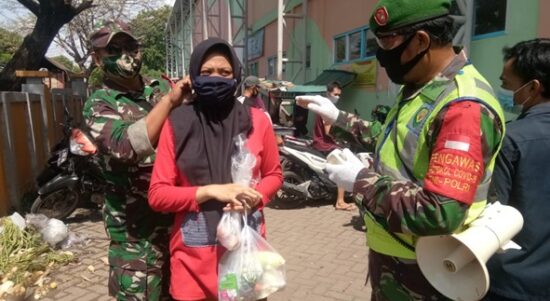 CILEGON – Anggota Koramil 2301/Cilegon Kodim 0623/Cilegon melaksanakan kegiatan Adaptasi Kebiasaan Baru (AKB) Protokol kesehatan (Prokes) di Pasar Kelapa Kecamatan Cilegon Kota