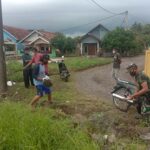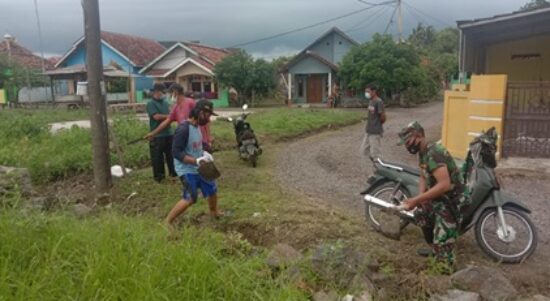 KABUPATEN SERANG – Babinsa Koramil 2304/Anyar Kodim 0623/Cilegon Sabtu Karya Bakti (Karbak) giat pembersihan saluran air dan giat pembagian masker di wilayah