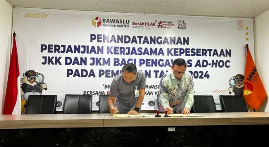 SERANG – BPJS Ketenagakerjaan Wilayah Banten bersama Badan Pengawas Pemilihan Umum (Bawaslu) Provinsi Banten melakukan penandatangan perjanjian kerjasama (PKS) terkait perlindungan kepada