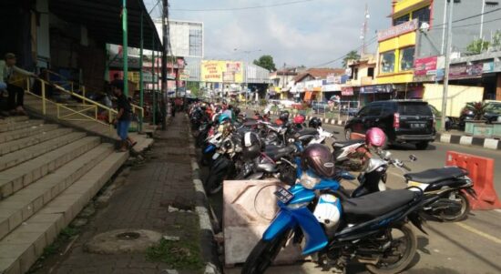 Pandeglang –  Hampir separuh badan jalan umum di depan Pasar Badak Pandeglang saat ini dijadikan tempat parkir kendaraan roda dua dan roda