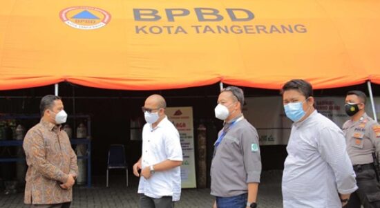 KOTA TANGERANG – Wali Kota Tangerang H. Arief R. Wismansyah meninjau posko pengisian tabung oksigen kapasitas 1 M³ bagi masyarakat Kota Tangerang