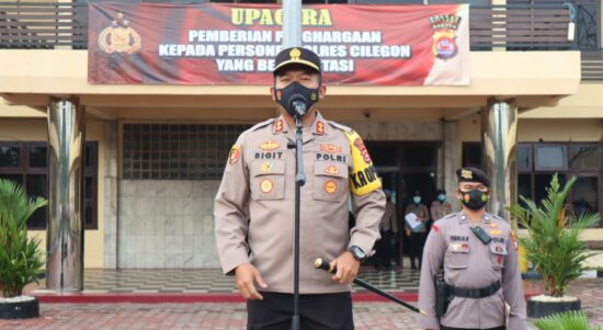 CILEGON – Polres Cilegon menggelar Apel sekaligus pemberian penghargaan bagi personel Polri yang berpresatasi di Lapangan Mabes Polres. Senin, (29/3/2021). Sesuai dengan