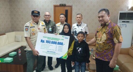 SERANG – Badan Penyelenggara Jaminan Sosial (BPJS) Ketenagakerjaan Cabang Serang serahkan santunan JKK meninggal dunia kepada ahli waris dari Almarhum Heri Supriyadi