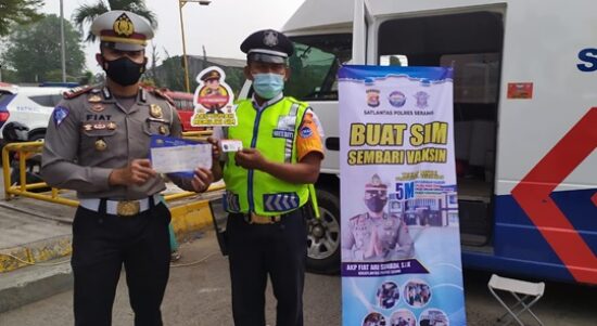 SERANG – Satlantas Polres Serang melaksanakan kegiatan suntik vaksin Covid-19 keliling dan SIM keliling dalam rangka bakti sosial PPKM Level 3 di