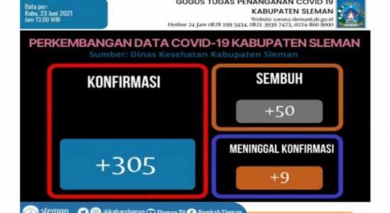 Sleman – Satuan Tugas (Satgas) Penanganan Covid-19 Kabupaten Sleman, Daerah Istimewa Yogyakarta mencatat terdapat penambahan kasus konfirmasi positif Covid-19 sebanyak 305 kasus
