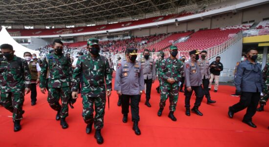 JAKARTA – Panglima TNI Marsekal Hadi Tjahjanto dan Kapolri Jenderal Listyo Sigit Prabowo melakukan peninjauan langsung vaksinasi massal di Stadion Utama Gelora