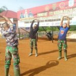 Merangin – Mengawali kegiatan pagi, anggota Satgas TMMD Pratu Edis memimpin senam peregangan di lapangan Desa Bukit Beringin, Kecamatan Bangko Barat, Kabupaten