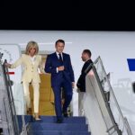 Presiden Republik Prancis Emmanuel Macron bersama Ibu Negara Brigitte Macron tiba di Jakarta, Indonesia, Selasa malam, 27 Mei 2025, dalam rangka kunjungan