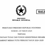 Presiden Prabowo Subianto mengeluarkan Peraturan Presiden Republik Indonesia (Perpres) Nomor 139 Tahun 2024 tentang Penataan Tugas dan Fungsi Kementerian Negara Kabinet Merah